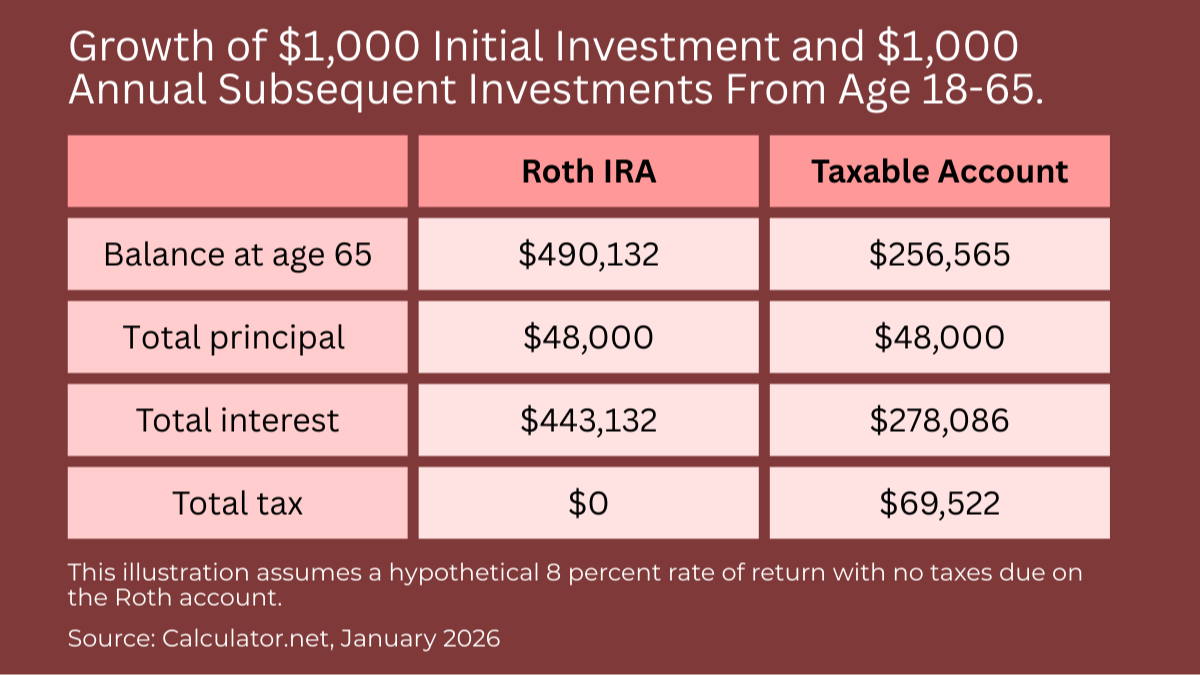For example, if your child opens a Roth IRA at age 18 with a $1,000 initial investment from a part-time job and adds just $1,000 per year thereafter, assuming a hypothetical 8 percent average annual return, the account would be worth nearly $500,000 when your child turns 65. Remember, Roth IRA contributions are made with after-tax dollars so there are no taxes on qualified distributions in retirement.1